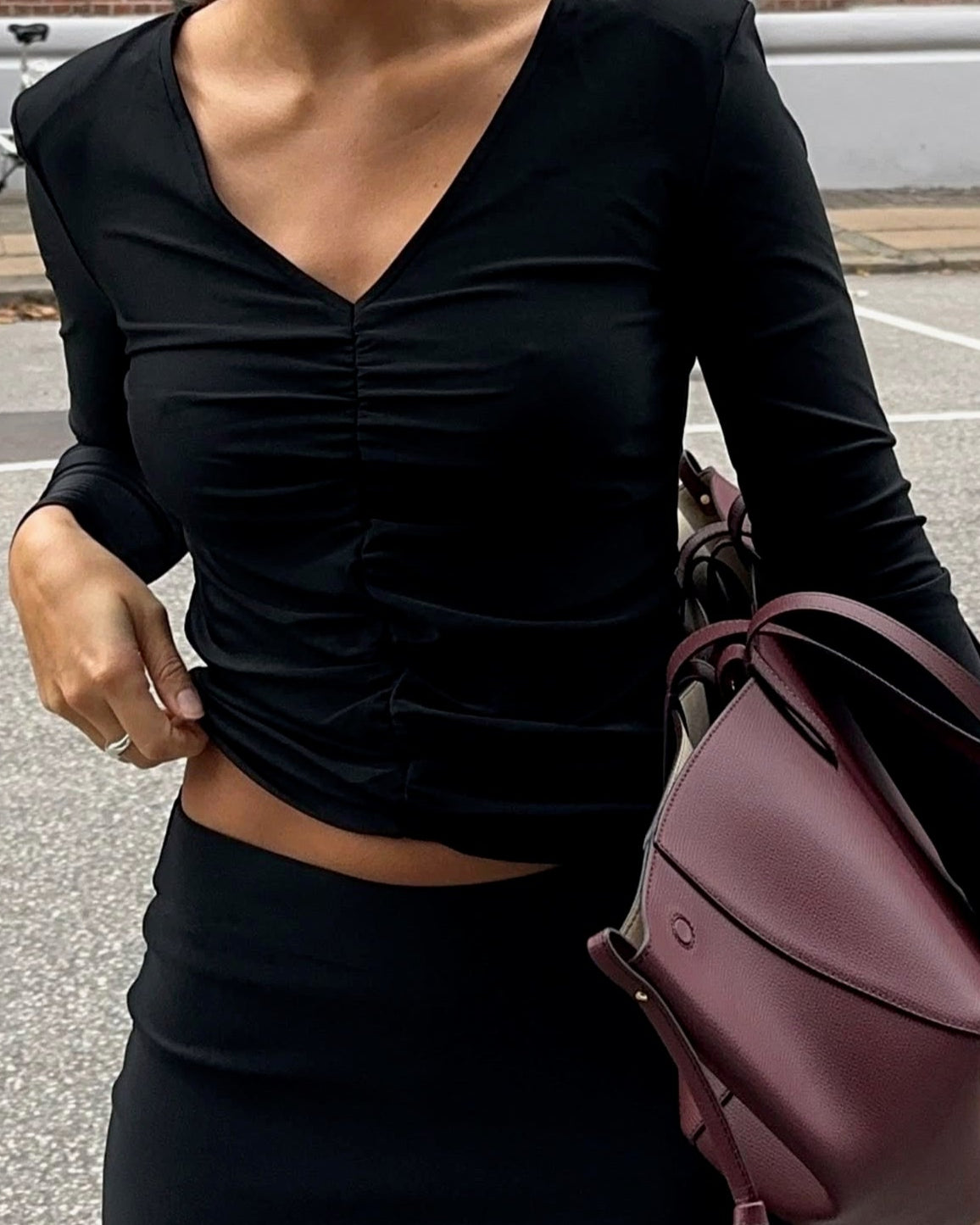 De lange ærmer og den gennemtænkte skulderkonstruktion giver blusen en alsidig karakter. Du kan nemt style den til både arbejde og sociale arrangementer. Rynkedetaljerne tilfører et interessant element til selv de enkleste outfits.