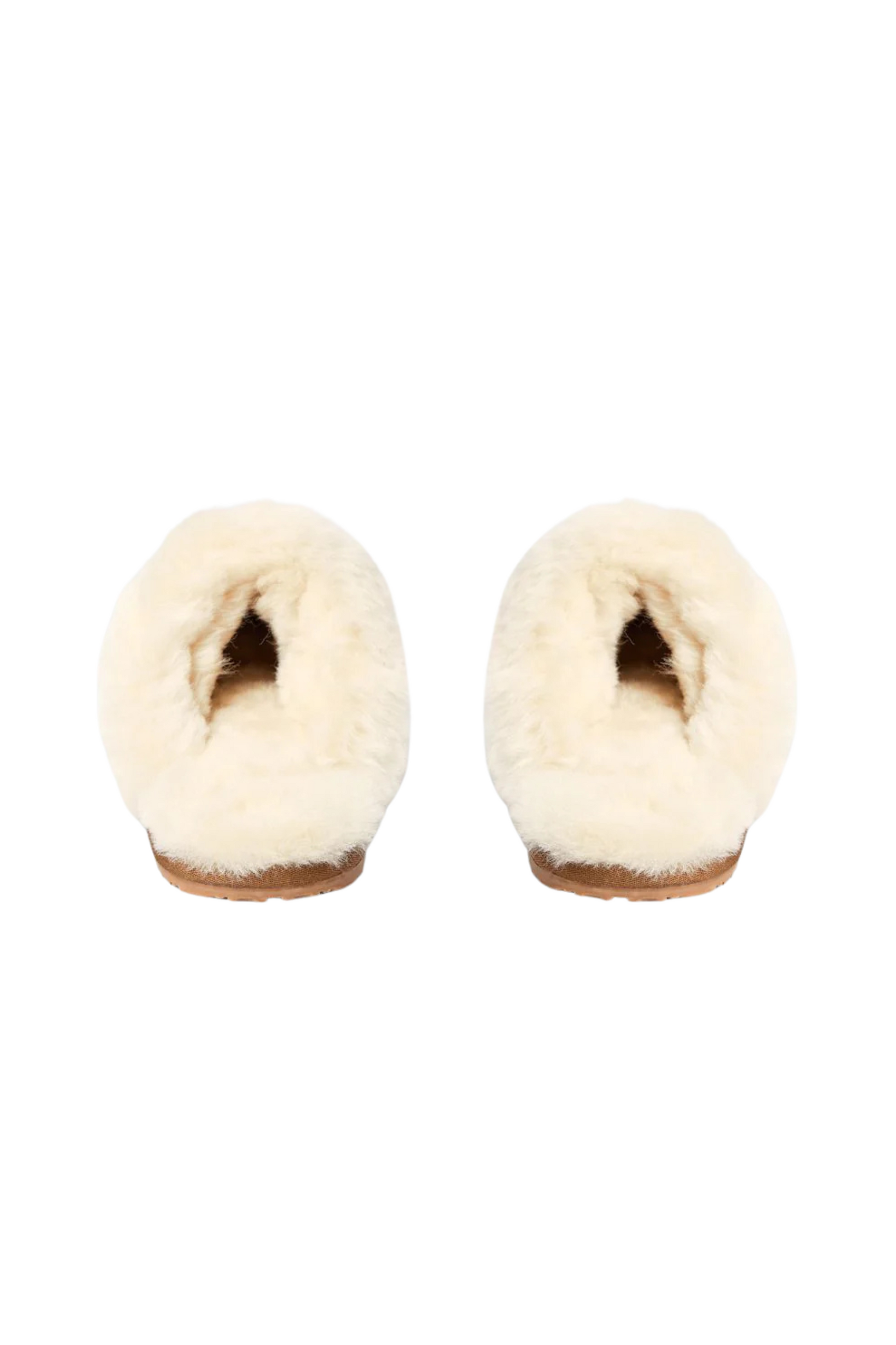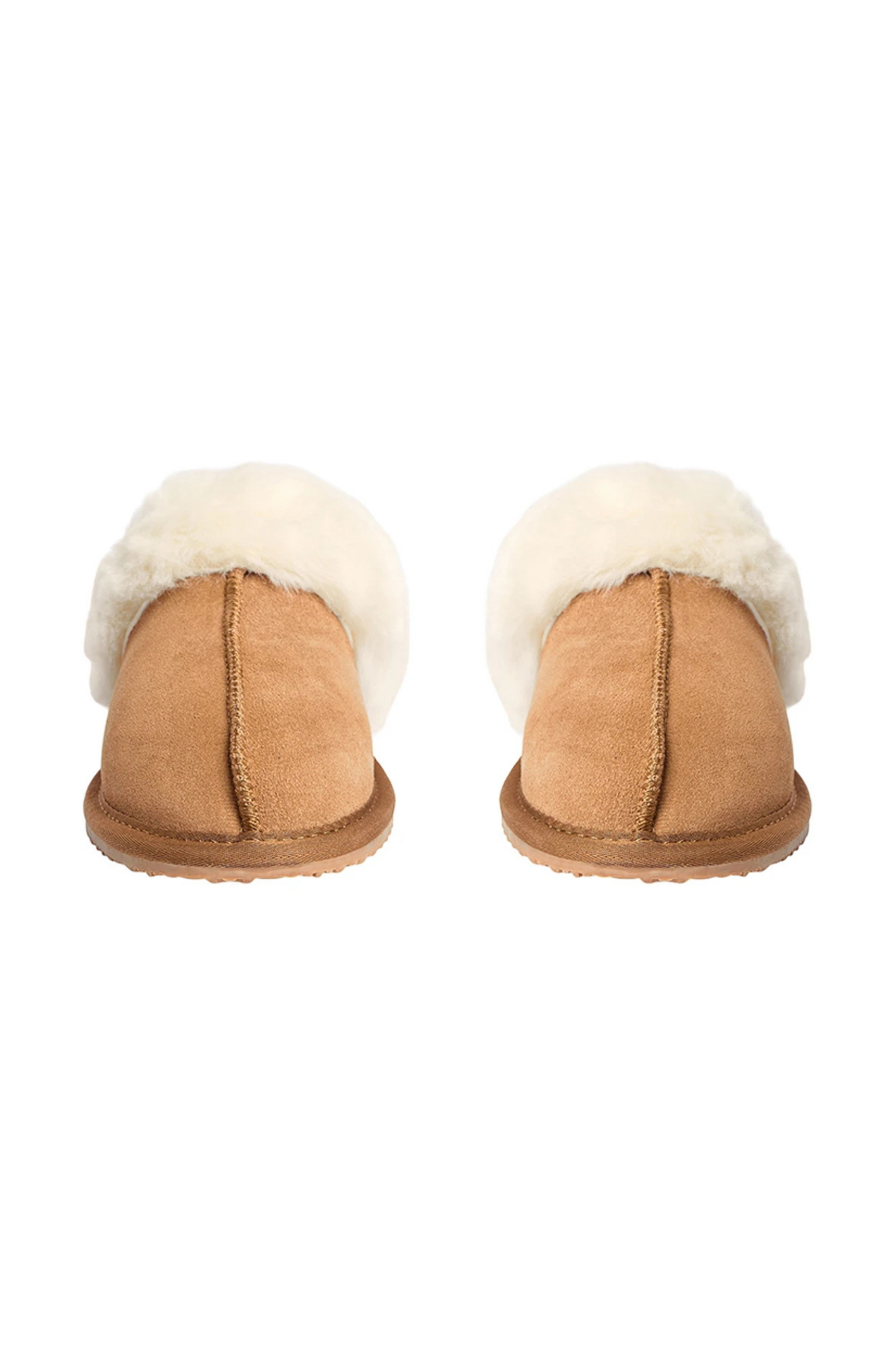 Bettina-hjemmeskoen sætter standarden for ren afslapning. Den er fremstillet i tanfarvet ruskind, som giver et stilrent og varmt udtryk, mens den kraftige, hvide fårepelskant omslutter foden med en dejligt blød fornemmelse. Indeni mødes du af samme luksuriøse fårepels, der giver en lun og let oplevelse for hvert skridt.