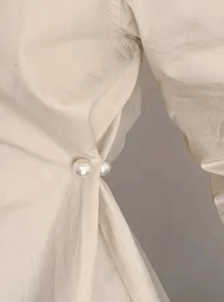 Dette spænde med to hvide perler i forskellige størrelser giver mulighed for at stramme løst tøj ind. Den glatte overflade sikrer, at spændet ikke beskadiger stoffet, og det kan bruges til både skjorter og bukser.