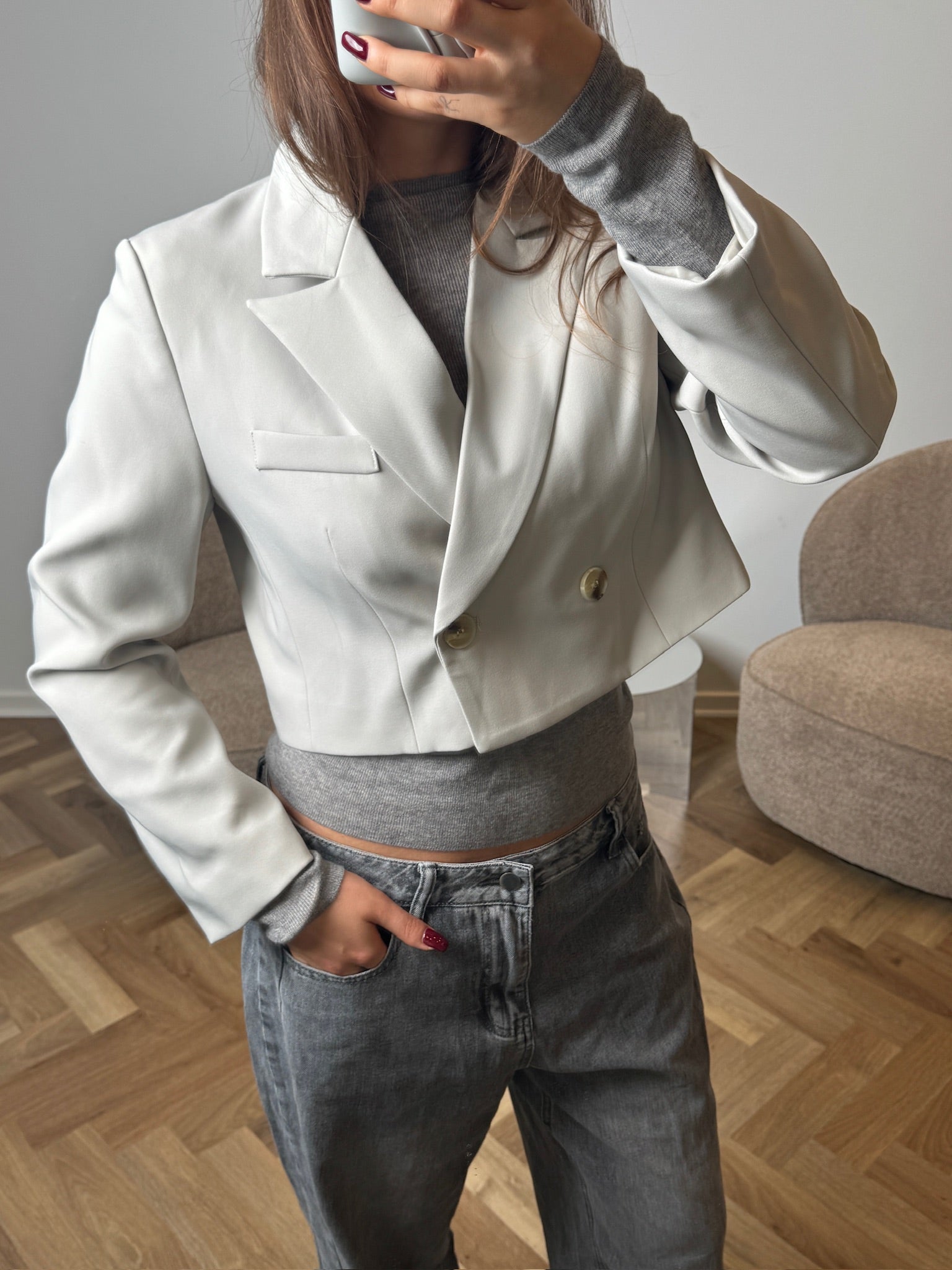 Kort blazer fra The collection. Blazeren har en v-udskæring, langeærmer og en fin halskrave. Blazeren har to knapper foran.