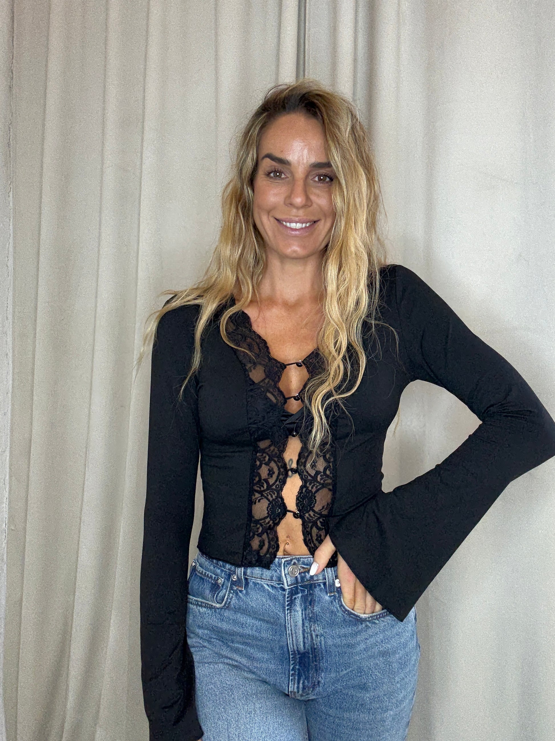 Fin bluse med blonder fra The Collection. Blusen har en v-udskæring som lukkes med knapper foran samt blonder ned langs fronten. Blusen er kort i modellen
