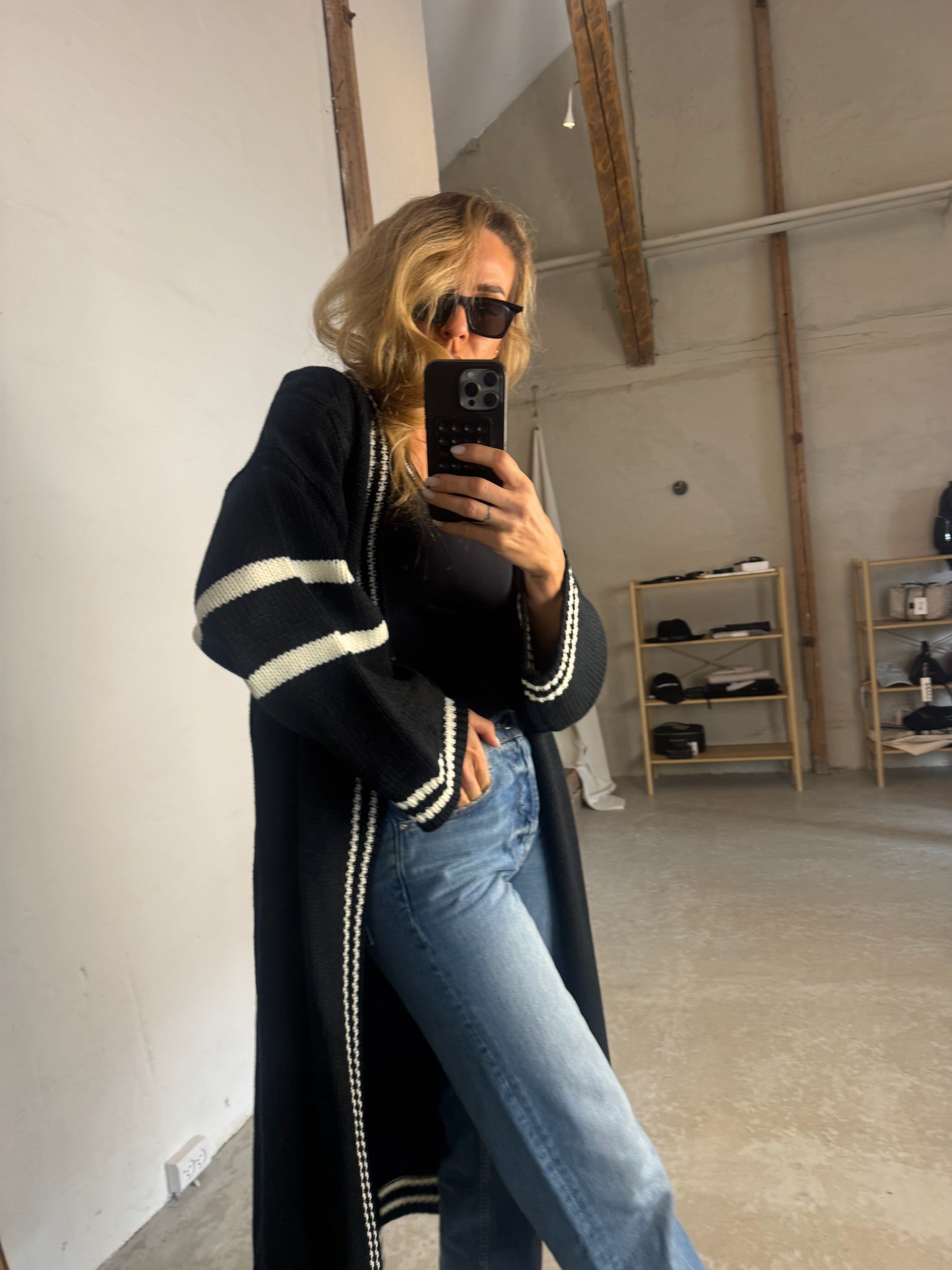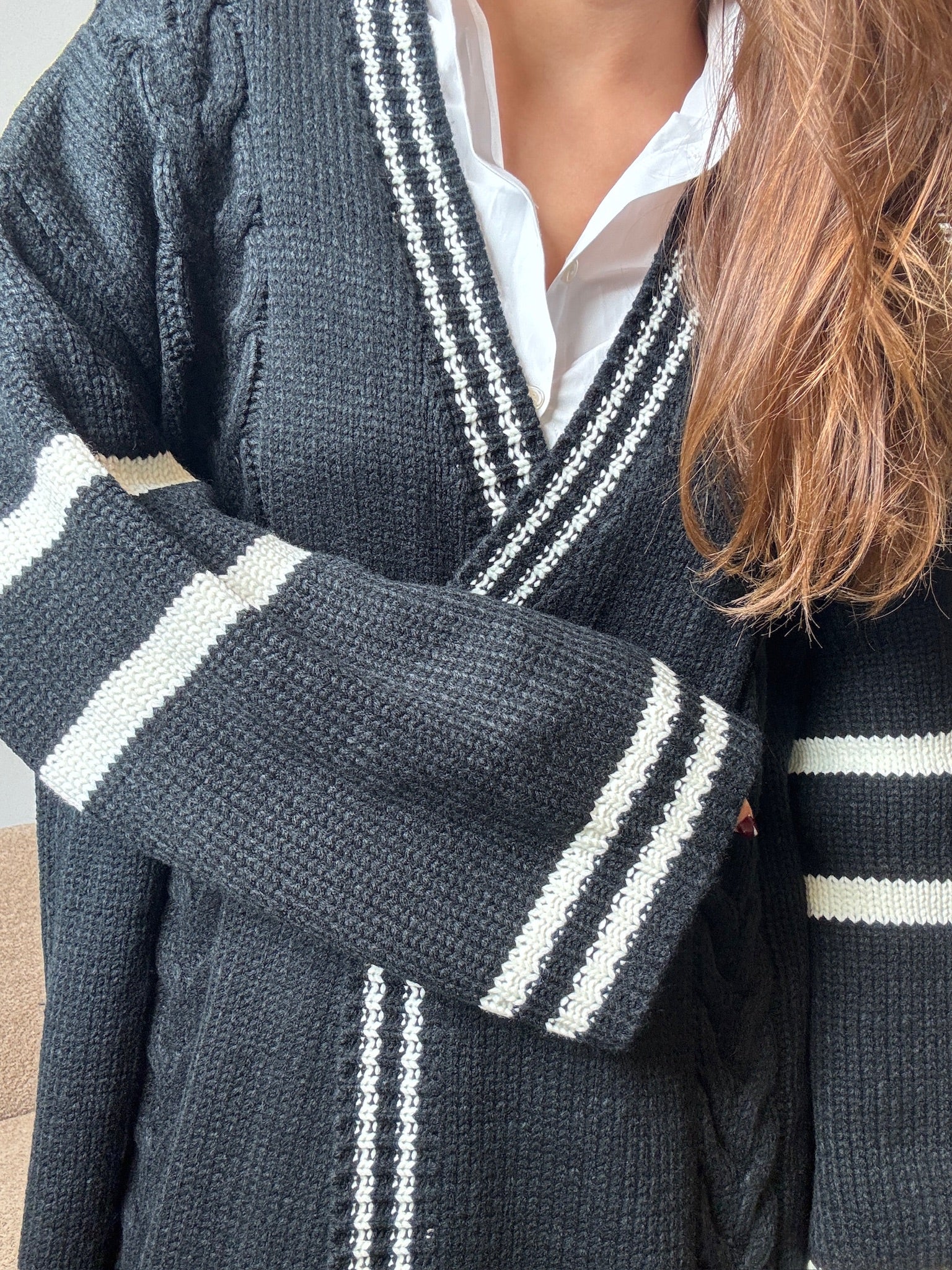Lang strikket cardigan fra The collection. Cardiganen er i sort med hvide stribede detaljer.