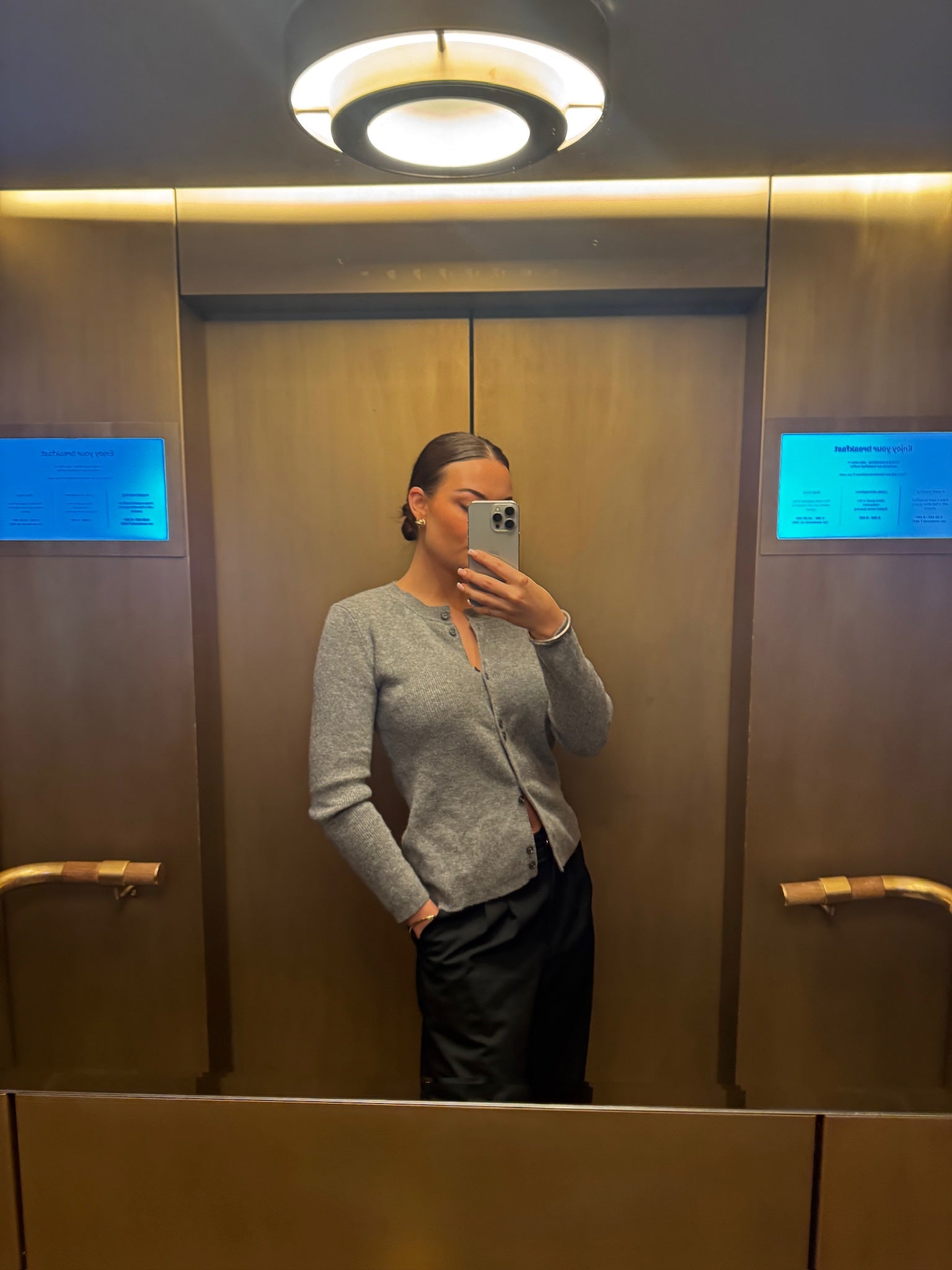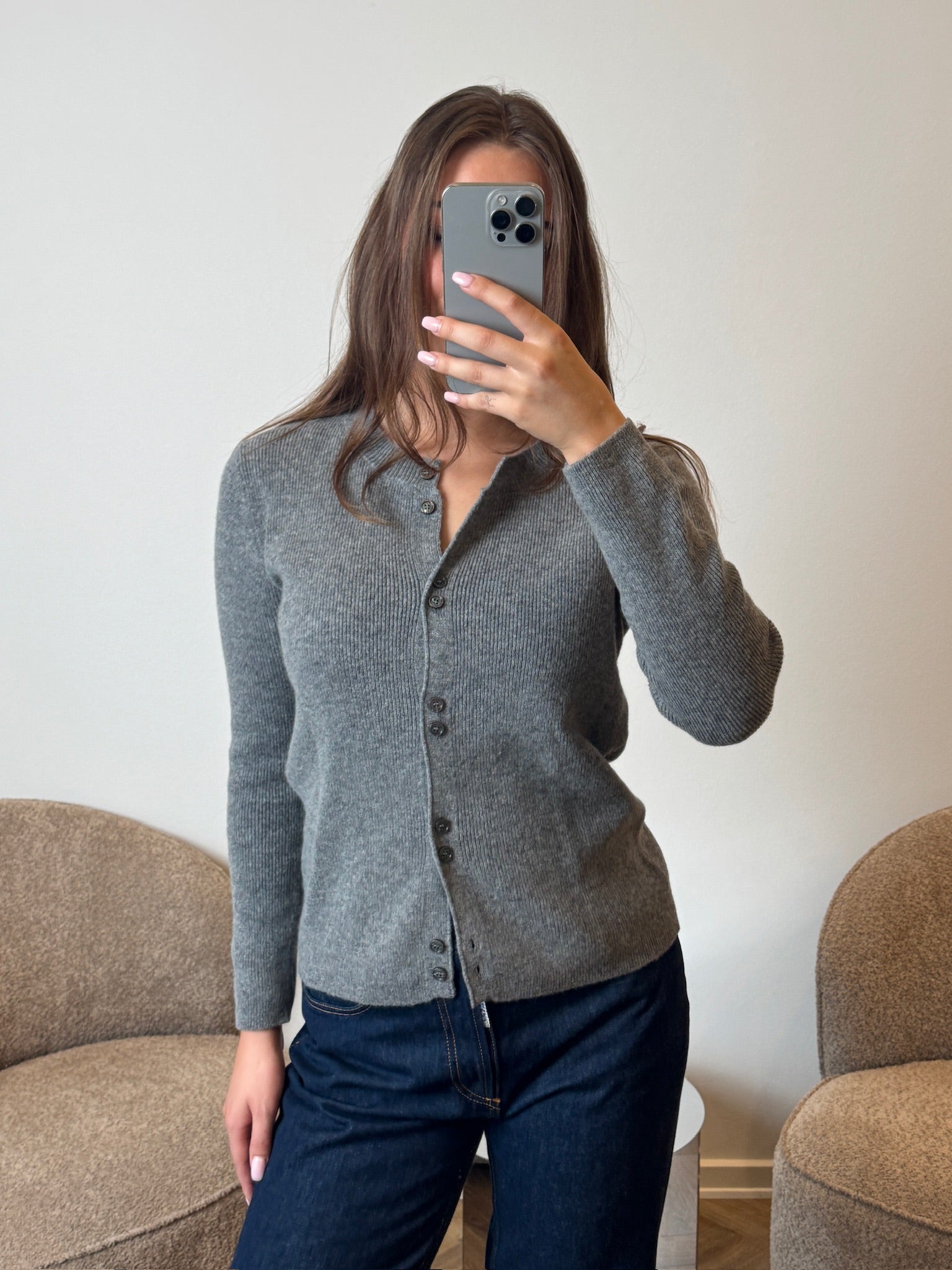 Lækker uld cardigan fra The Collection. Cardiganen er i en grå farve og har dobbelt knapper hele vejen ned som er med til at give et elegant udtryk.