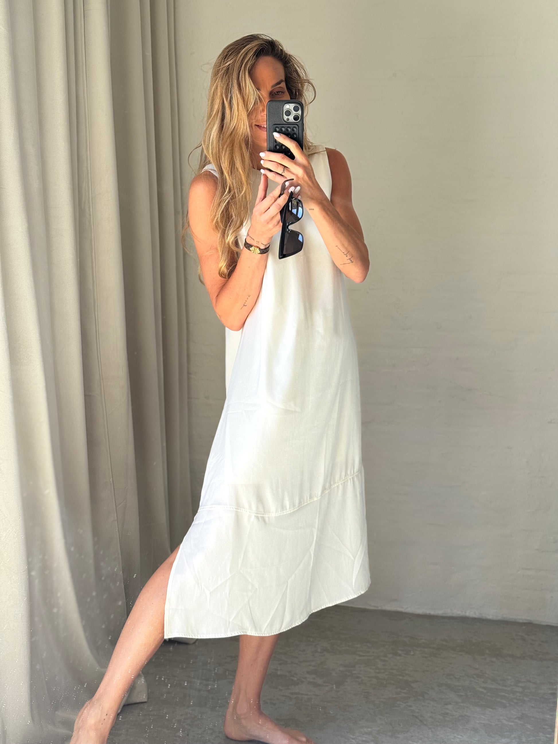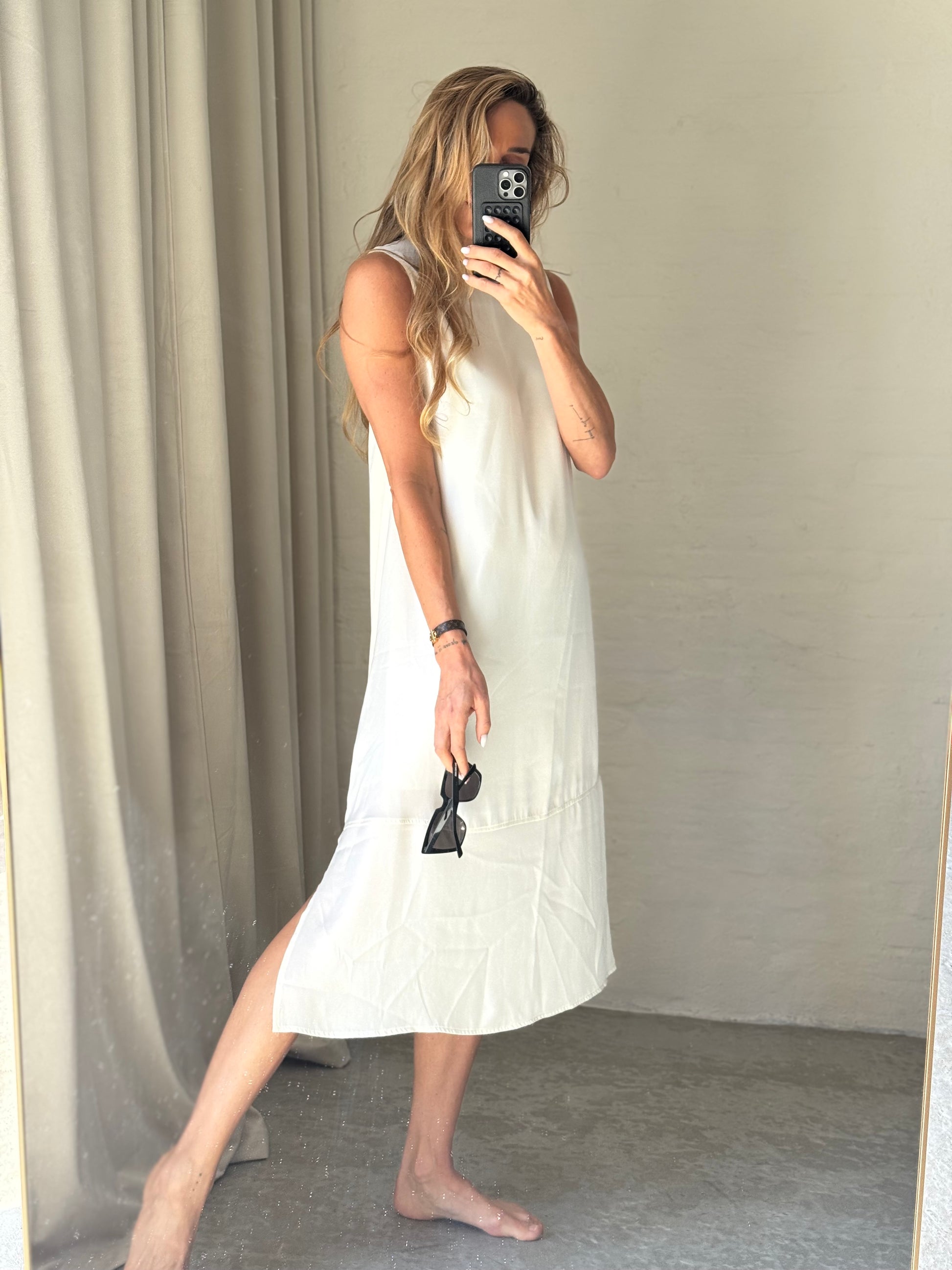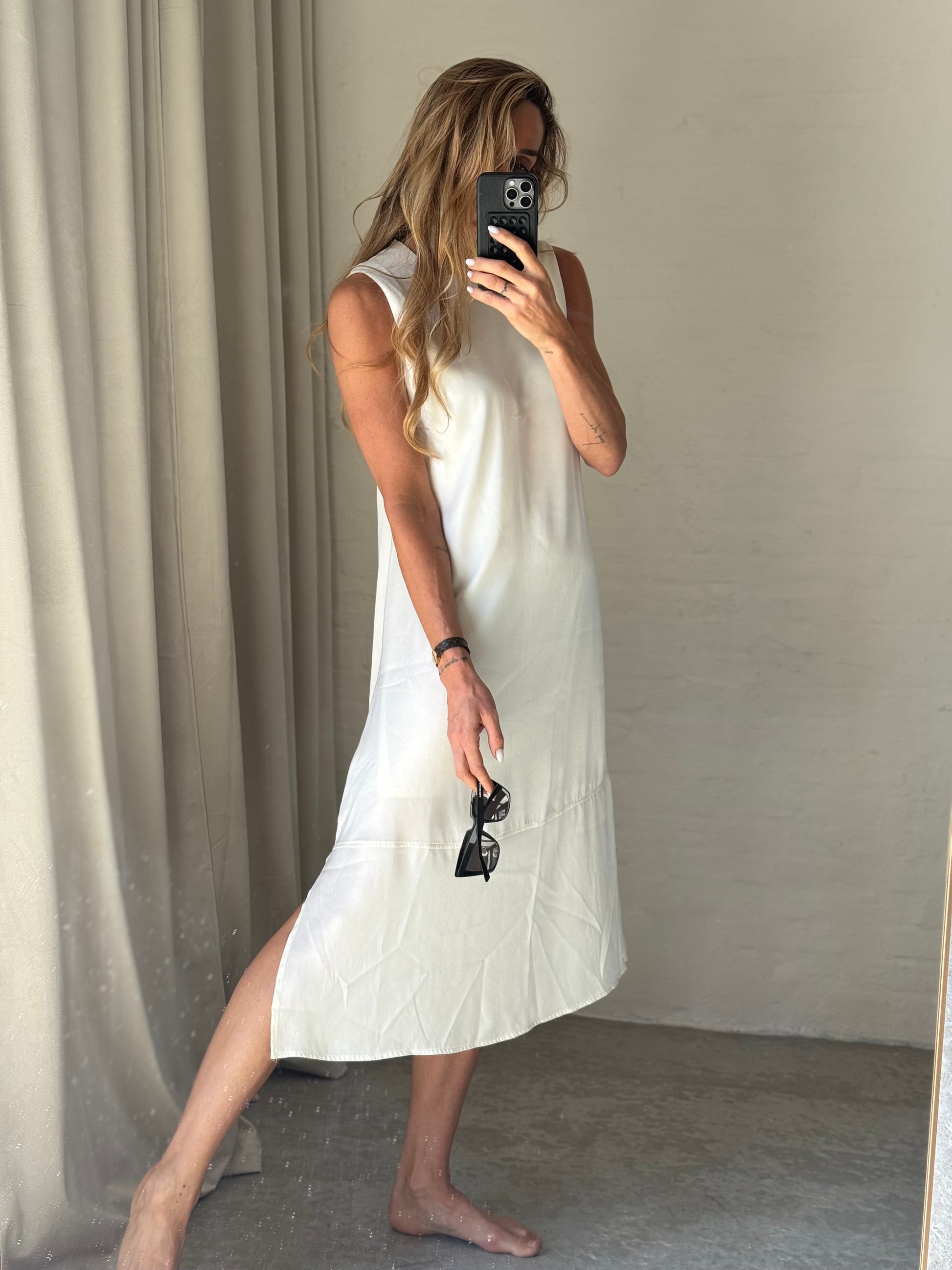 En lang elegant kjole fra The Collection. Kjolen har en løs pasform og har brede stropper. Derudover den en syning nede i bunden som er en fin detalje på kjolen.