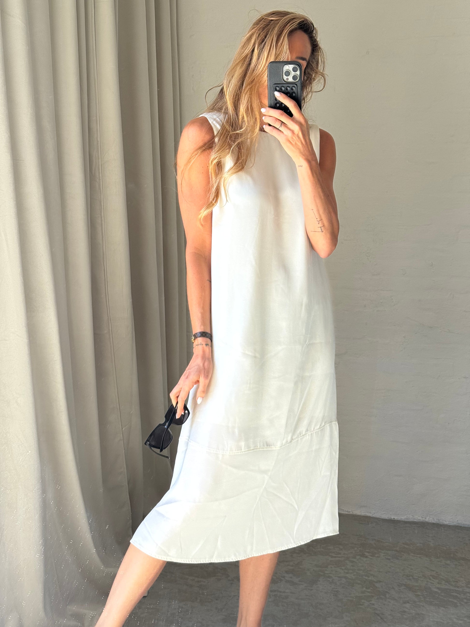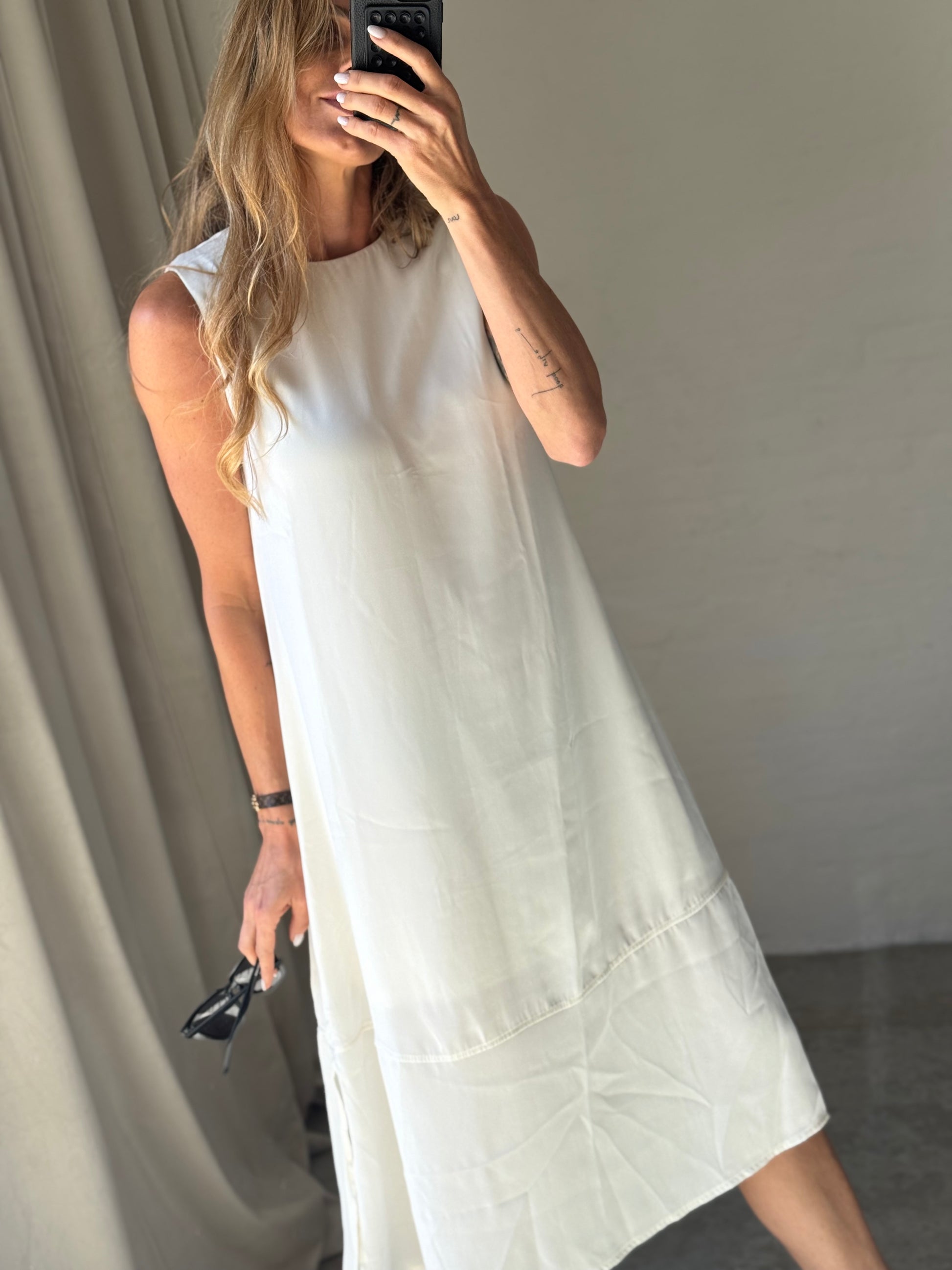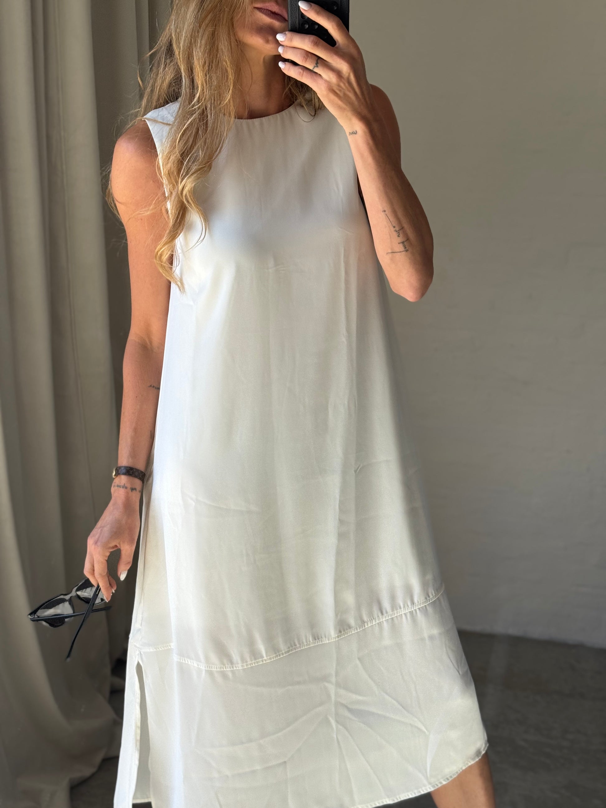 En lang elegant kjole fra The Collection. Kjolen har en løs pasform og har brede stropper. Derudover den en syning nede i bunden som er en fin detalje på kjolen.