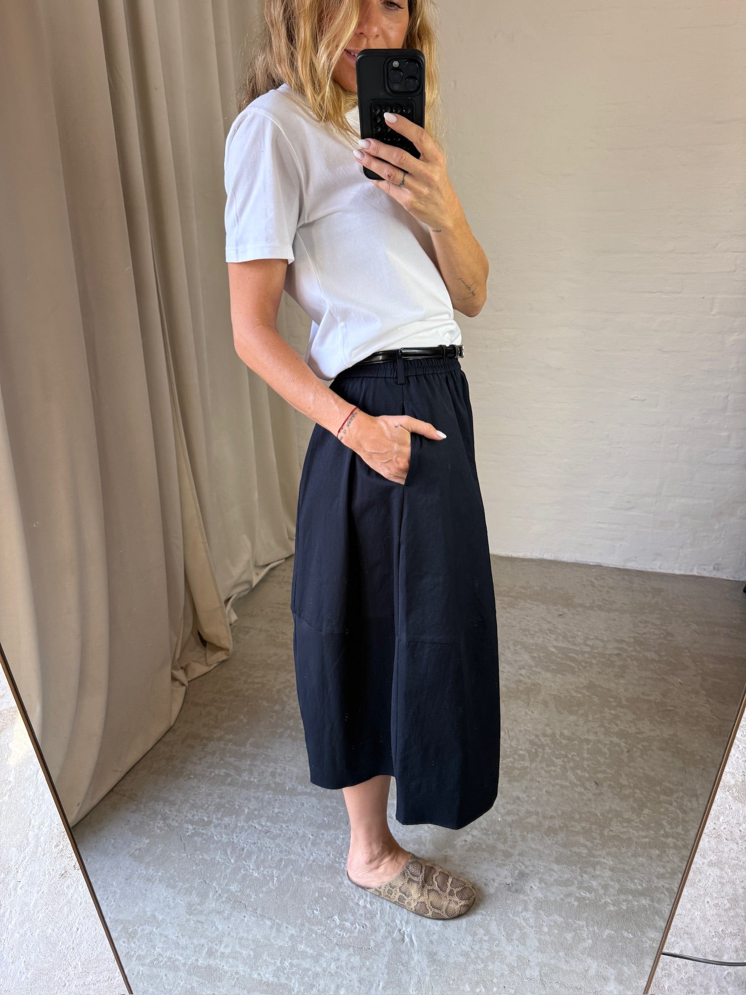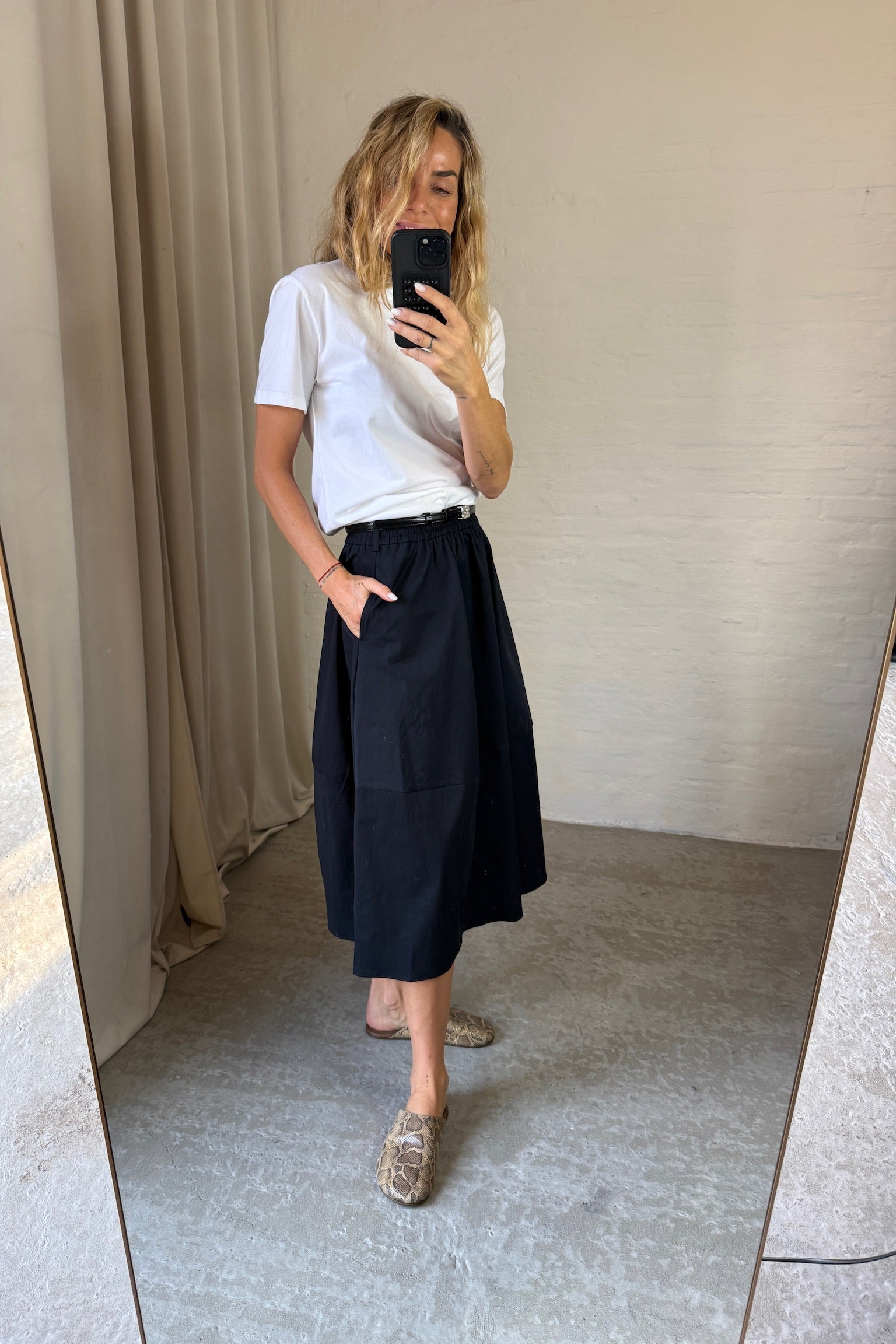 Lang sort nederdel fra The Collection. Nederdelen har en løs pasform som går ud i en a-form, derudover er det elastik i taljen samt bæltestropper. På selve nederdelen er der nogen fin syningsdetaljer.