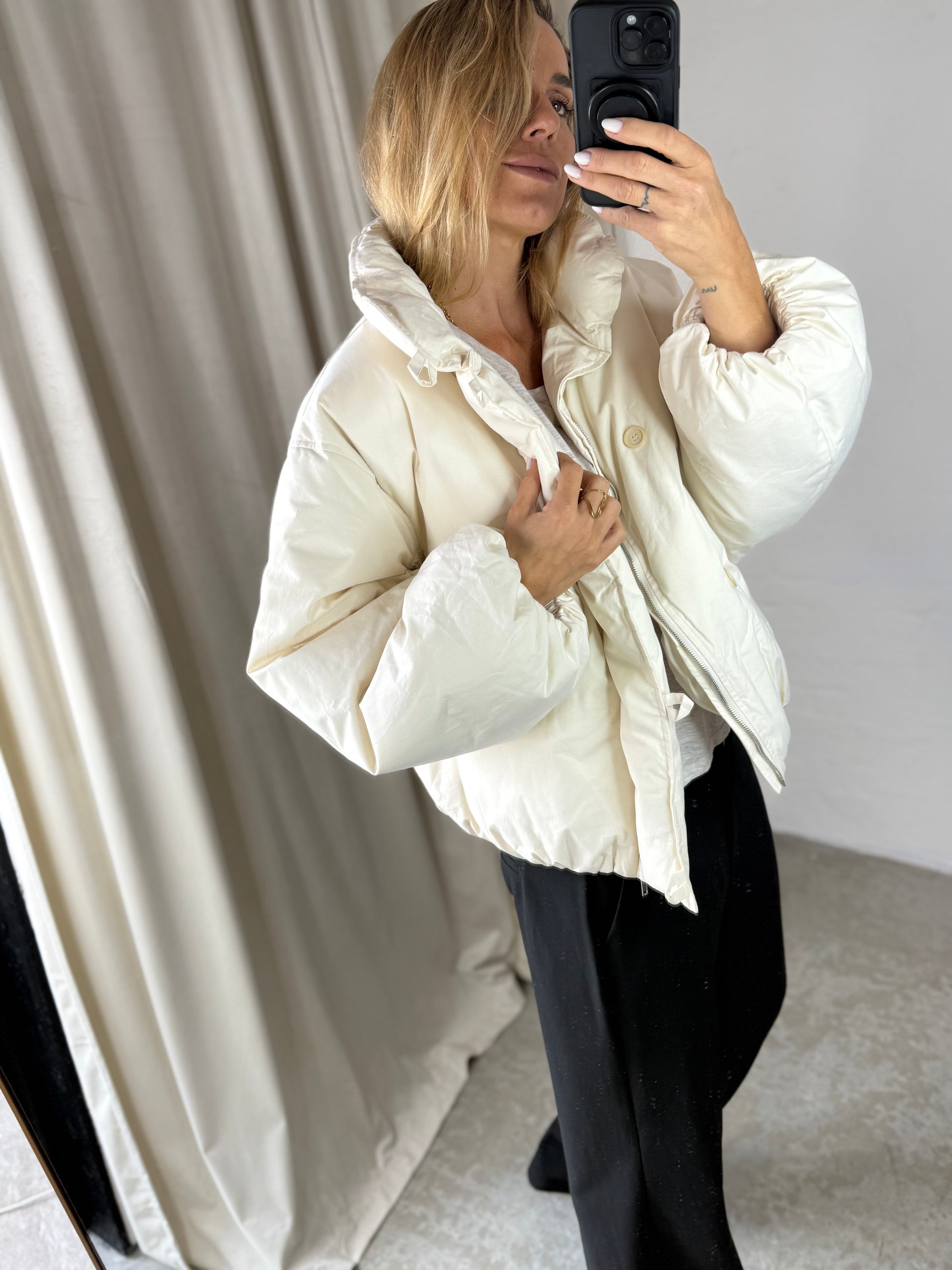 Den neutrale off-white farve gør jakken nem at style med din eksisterende garderobe. One size-modellen giver en afslappet pasform, mens den dobbelte lukning med både lynlås og knapper lader dig justere jakken efter behov.